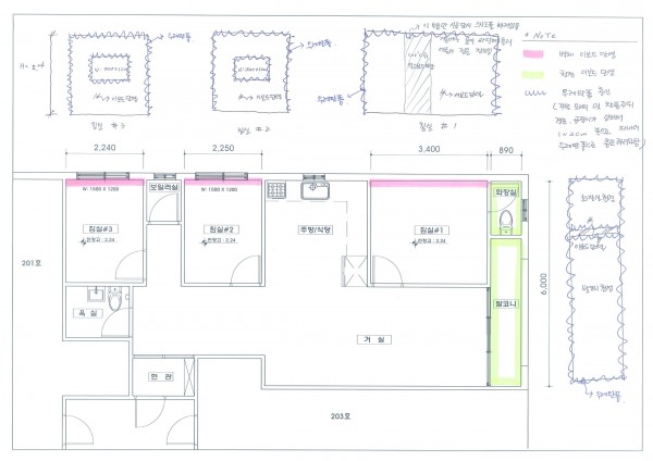 침실#1 은 시공당시 con\'c 위에 50T정도의 스치로폴 시공한 것 같은데... 벽 중간에 30~40cm정도 스치로폴이 빠져 있어서 현재 석고보드만 잘라놓고 벽 말리고 있는데... 그부분에서 결로가 더 심해져서 이불이 젖을 정도로 물이 바닥으로